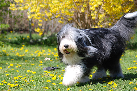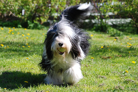 Pinot med tennisboll bland vårblommorna...