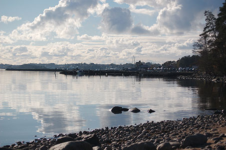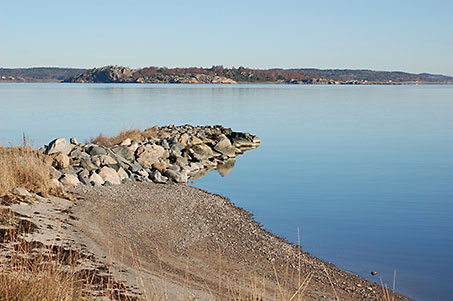 Spegelblank fjord med Kalvö i bakgrunden
